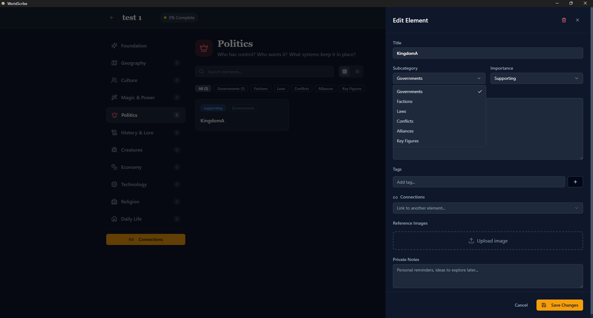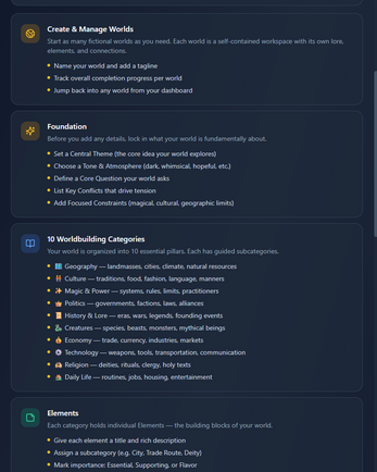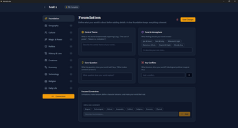 A comprehensive Desktop worldbuilding tool for authors, game developers, and creators to design interconnected fictional worlds, from foundational concepts to intricate details.